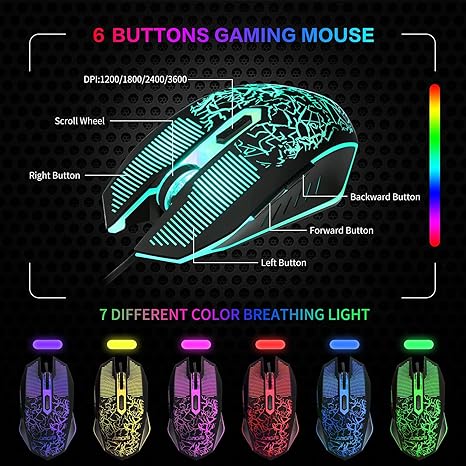 - 【LED Wired Game Mouse】The ergonomically designed mouse can easily switch between 4 DPIs (1200,1800,2400,3200). 4 buttons. Long press and hold the DPI button to switch between 7-color breathing and red light modes.